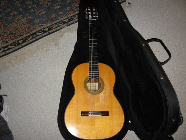 (Zie afbeelding) Mijn concert-gitaar, een absolute top-gitaar. Geheel met de hand gemaakt in 1998, met een fichte bovenblad, en Rio (Braziliaans) palissander zij- en achterbladen. Deze gitaar zingt fantastisch in alle registers. Hij is overigens wel aan revisie toe.